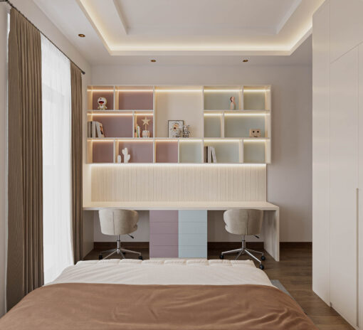 - Tiết kiệm diện tích: Tích hợp 2 trong 1 (Bàn học + Tủ sách/Tủ trang trí).
