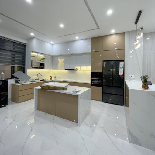 Hệ Tủ Bếp Acrylic Phối Màu Hạnh Nhân GP – Không Gian Bếp Hiện Đại, Thanh Lịch Và Đầy Tinh Tế
